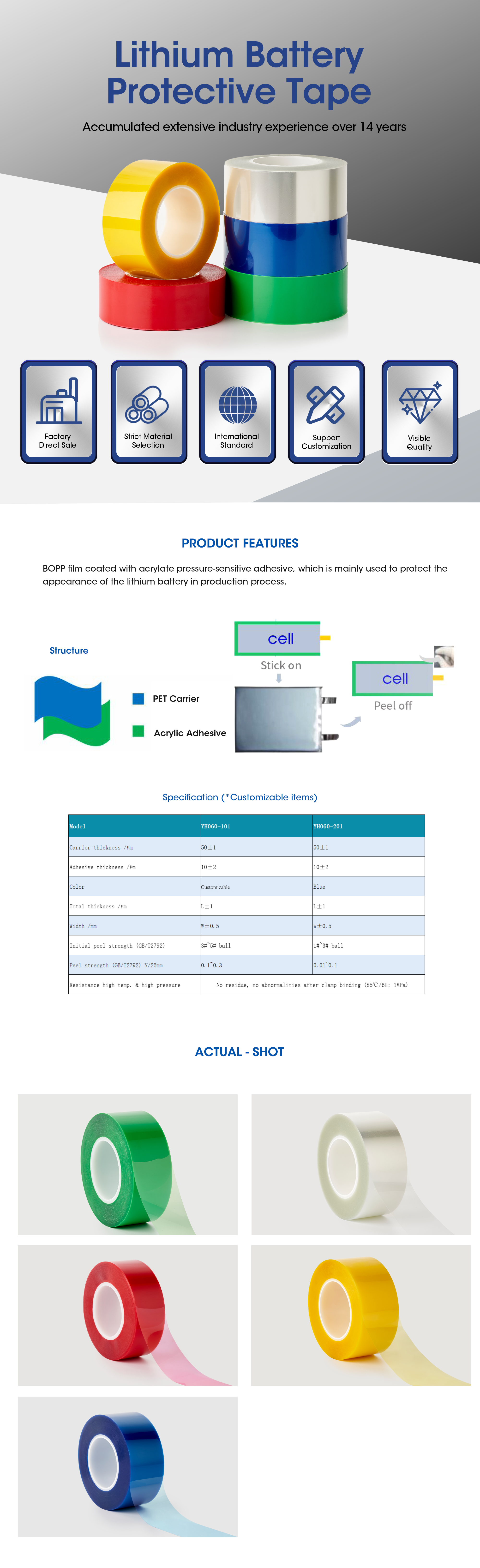 BOPP film coated with acrylate pressure-sensitive adhesive, which is mainly used to protect the appearance of the lithium battery in production process.